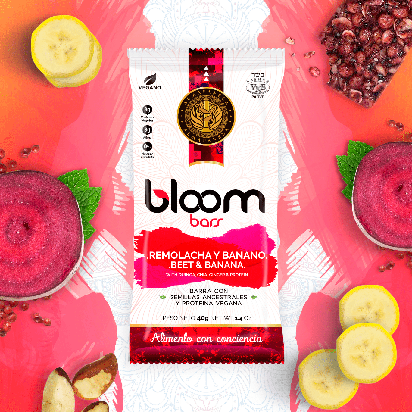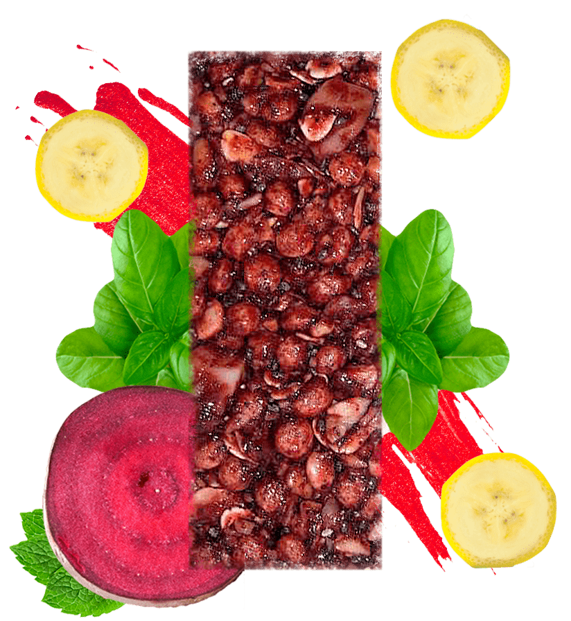 Barra energética aglomerada con miel de caña orgánica y enriquecida con nutrientes naturales provenientes de: leguminosa (harina de garbanzo), cereales en hojuelas (avena), seudocereales (quinua expandida y semillas de chía), fruta deshidratada en trozos (banano), hortaliza pulverizada (remolacha), frutos secos en trozos (nuez brasil y maní), especias y minerales (sal marina y especias como canela, clavos, anís y jengibre).