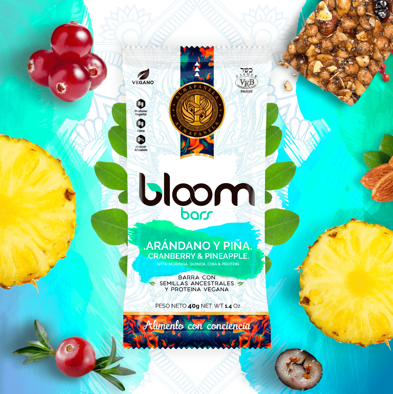 Barra energética y nutricional aglomerada con miel de caña orgánica y enriquecida con nutrientes naturales provenientes de: hojas pulverizadas (moringa), leguminosa (harina de garbanzo), cereales en hojuelas (avena), seudocereales (quinua expandida y semillas de chía), fruta deshidratada en trozos (arándanos y piña), frutos secos en trozos (almendra) y minerales (sal marina).