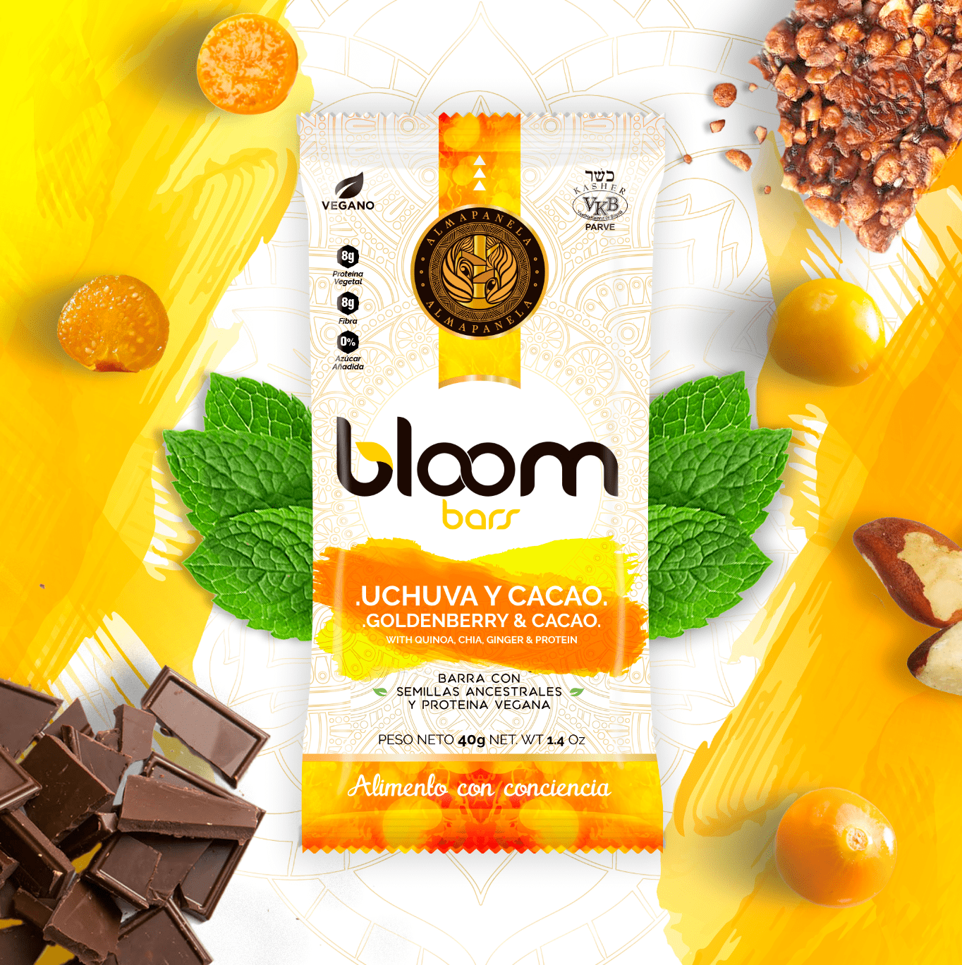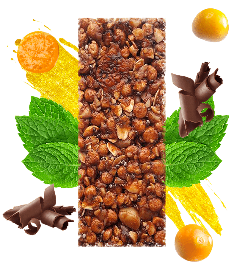 Barra energética y nutricional aglomerada con miel de caña orgánica y enriquecida con nutrientes naturales provenientes de: leguminosa (harina de garbanzo), cereales en hojuelas (avena), seudocereales (quinua expandida y semillas de chía), fruta deshidratada en trozos (uchuva), frutos secos en trozos (maní y nuez brasil), nips de cacao (cacao al 100%), especias y minerales (sal marina y especias como canela, clavos, anís y jengibre).